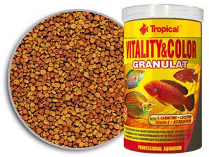 Krmivo s vysokým obsahem bílkovin ve formě zvolna klesajícího granulátu, zvýrazňující vybarvení a vitalizující, určené ke každodennímu krmení všežravých a masožravých ryb. Vzhledem ke zvýšenému obsahu bílkovin, vitamínu E a lecitinu se doporučuje především v období růstu a množení ryb. V krmivu jsou přítomná přírodní barviva – betakarotén a astaxanthin z červených řas Haematococcus pluvialis, které ovlivňují zintenzivnění barev ryb a mají prospěšný vliv na průběh mnohých fyziologických procesů, včetně rozmnožování, a chrání buňky proti škodlivému působení volných radikálů. Aby byly ryby schopny lépe využívat tuky obsažené v krmivu, byl Vitality & Color Granulat obohacený L-karnitinem, který podporuje jejich metabolismus.
